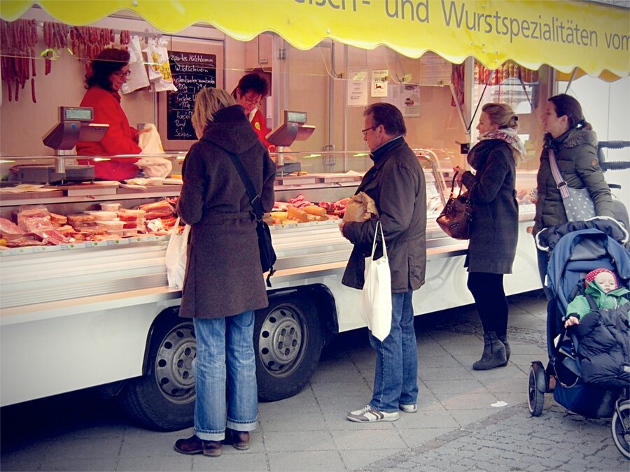 Es scheint als ob mit dem schönen Wetter auch die Schlangen vor den Ständen wiedergekommen sind. Sie haben mir nicht gefehlt aber ich freue mich für die Verkäufer, die nach ein paar kalten Monaten mit wenigen Kunden endlich wieder bei angenehmen Temperaturen arbeiten können und nicht immer die selben durchgefrorenen Kunden vor sich haben. Der einzige der sich nicht über die vielen Leute gefreut hat ist mein Freund Peter. Die vielen Leute stressen ihn. Er wird mit einem Mal ganz schweigsam und hoch konzentriert, kein Ratschen keine Fragen, nur Arbeit, sonst gehen die Leute zum nächsten Stand und das darf auf keine Fall passieren. Bravo Peter.